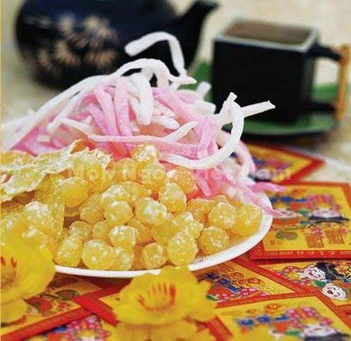 Mẹ bắc cái chảo to tướng lên bếp, đun nóng chảo một lúc rồi đổ đường vào. Tay mẹ cầm đôi đũa thật to đảo đều chảo đường, sau đó cho gừng hoặc cà rốt, bí đao… vào. Mẹ thường làm mứt cà rốt trước. Nhìn những miếng cà rốt tẩm đường xoay tròn trong chảo thật hấp dẫn. Đợi đến khi đường chảy hết thành nước và dính sát vào cà rốt thì mẹ xoay đũa nhanh hơn. “Sắp được rồi!”, nghe mẹ nói, mắt chúng tôi sáng rực lên. Chúng tôi thèm được thử những lát mứt đầu tiên ấy lắm nhưng vẫn phải đợi đến khi mứt nguội và rắn lại.